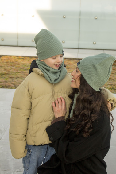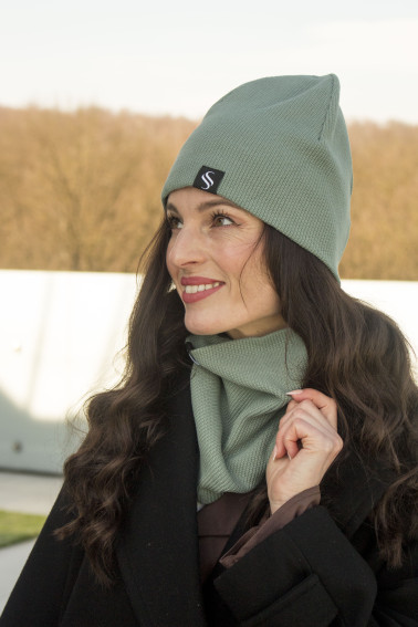 Trendy dámska čiapka, obľúbená vďaka svojmu "šmolko" strihu, spolu s nákrčníkom. Čiapka s nákrčníkom sú z príjemného pružného materiálu ktorý vôbec netlačí. Látka je jednofarebná no jemne štrukturovaná. Aj preto je set univerzálnym kúskom k športovejšiemu aj jemne elegantnejšiemu typu bundy alebo kabátu.