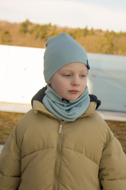 Trendy detská čiapka s nákrčníkom, obľúbená vďaka svojmu "šmolko" strihu. Čiapka je z príjemného pružného materiálu ktorý vôbec netlačí. Látka je jednofarebná no jemne štrukturovaná. Aj preto je univerzálnym kúskom k športovejšiemu aj jemne elegantnejšiemu typu bundy alebo kabátu.