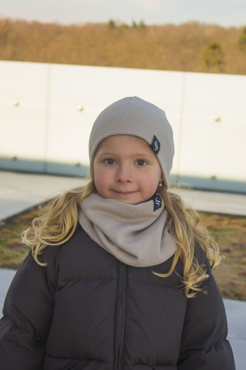Trendy detská čiapka s nákrčníkom, obľúbená vďaka svojmu "šmolko" strihu. Čiapka je z príjemného pružného materiálu ktorý vôbec netlačí. Látka je jednofarebná no jemne štrukturovaná. Aj preto je univerzálnym kúskom k športovejšiemu aj jemne elegantnejšiemu typu bundy alebo kabátu.